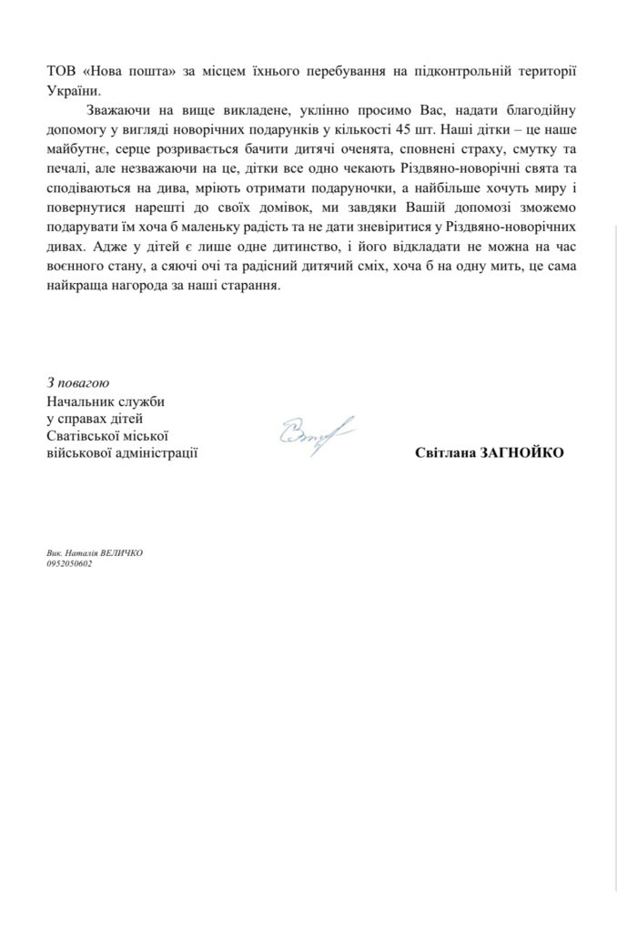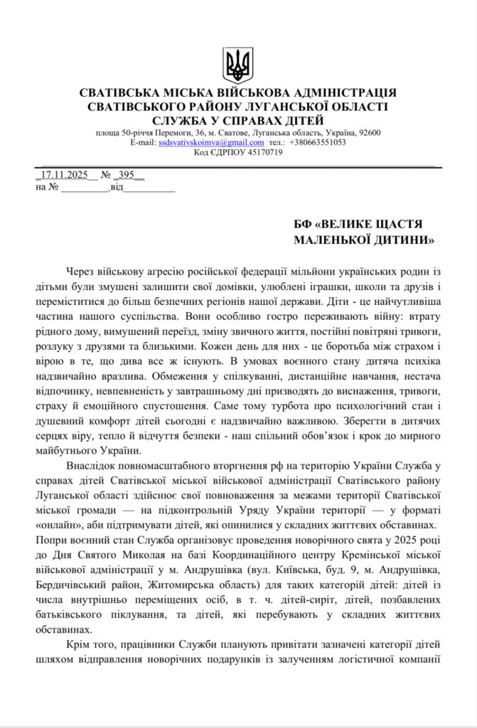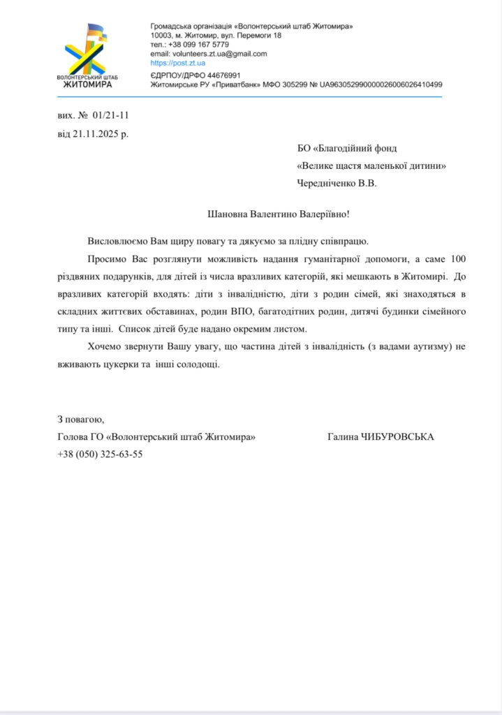 До нашого Благодійного Фонду «Велике щастя маленької дитини» звернулось дві організації з проханням подарувати 145 дітям сиротам, дітям з інвалідністю, дітям ВПО «Різдво»: ГО «Волонтерський штаб Житомира» та «Служба у справах дітей Сватівської міської військової адміністрації». Щоб не відбувалось навколо, а діти є дітьми: вони чекають на свято, на подарунки, на душевне тепло та посмішки, на диво та любов! Аби діти це відчули ми хочемо підготувати для них подарункові набори: солодощі, інтерактивні іграшки, канцелярські товари, дитячі іграшки та ін.