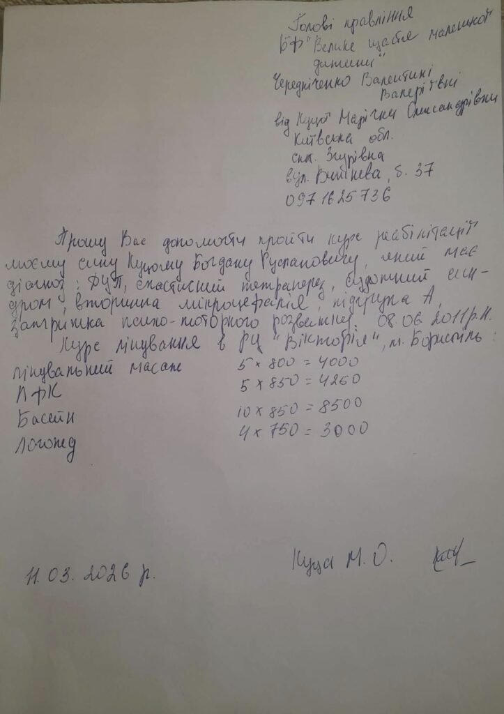 До нашого Благодійного Фонду «Велике щастя маленької дитини» звернулась Куца Марічка з проханням про допомогу в оплаті реабілітації для сина Богдана. Хлопчик має діагноз: ДЦП, спастичний тетрапарез, судомний синдром, вторинна мікроцефалія, підгрупа А, затримка психо-моторного розвитку. Займаючись з фаховими професіоналами у дитини є шанси на більш комфортне життя. Курс реабілітації пройде у центрі «Вікторія» в м.Бориспіль.