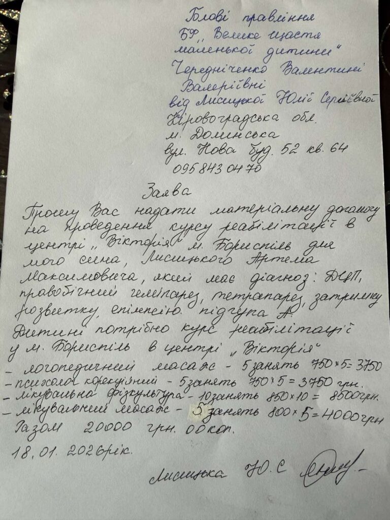 Для оплати реабілітації потрібно 20 000(двадцять тисяч) гривень.